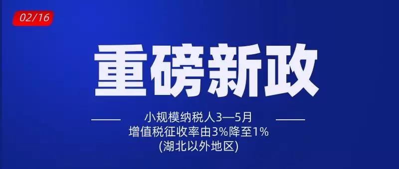 为支持广大个体工商户在做好新冠肺炎疫情防控同时加快复工复业,自2020年3月1日至5月31日,除湖北省外的省、自治区、直辖市的增值税小规模纳税人,适用3%征收率的应税销售收入,减按1%征收率征收增值税;适用3%预征率的预缴增值税项目,减按1%预征率预缴增值税。