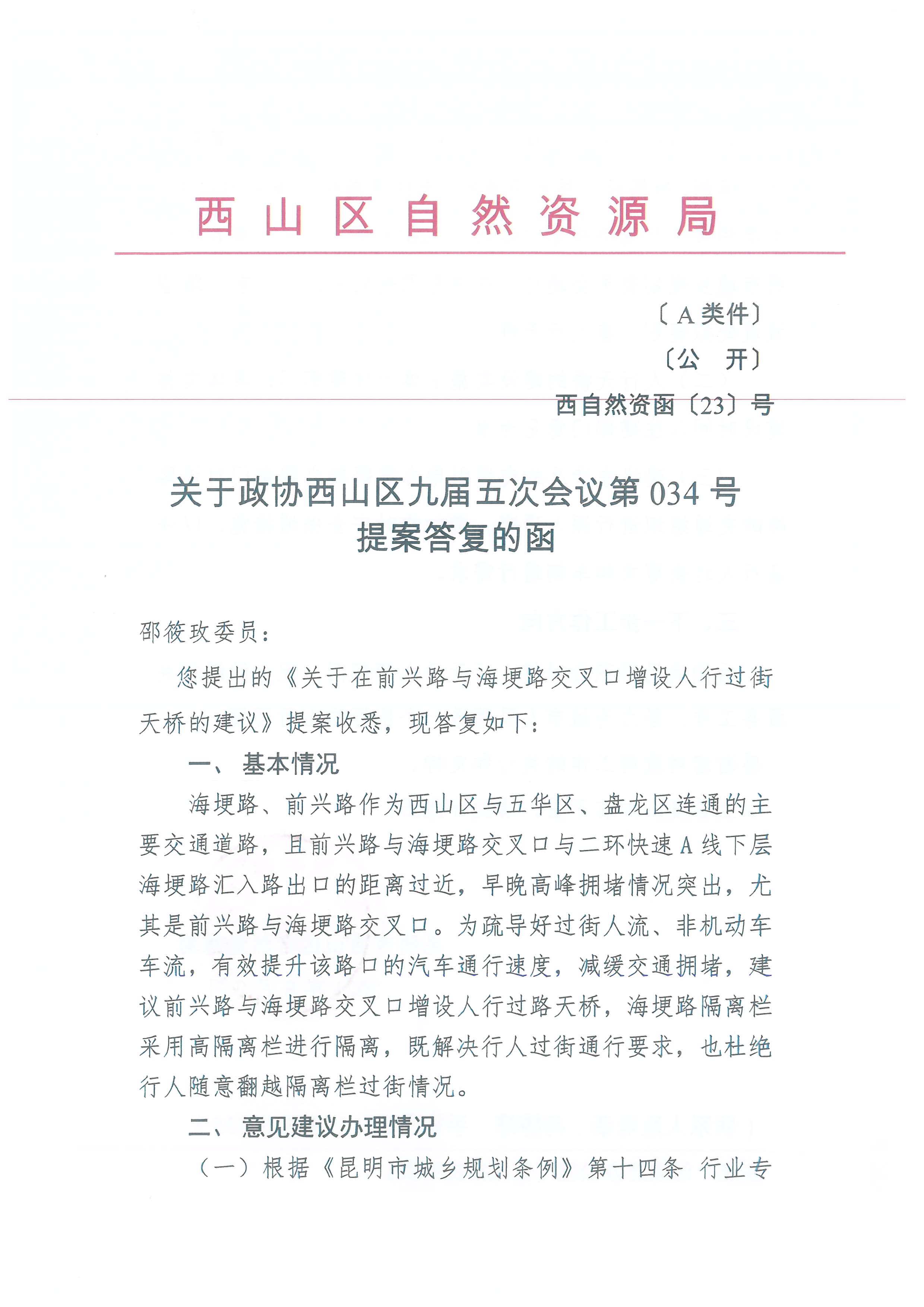 关于政协西山区九届五次会议第034号提案答复的函