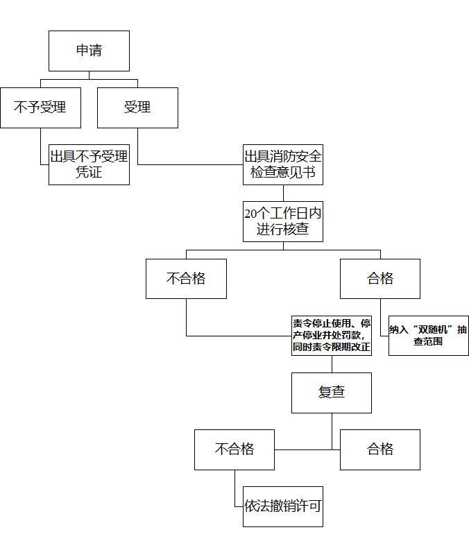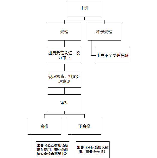 自受理申请之日起10个工作日内,按照《公众聚集场所投入使用、营业消防安全检查规则》对该场所进行检查,自检查之日起3个工作日内作出决定。对符合消防安全要求的,应当予以许可,并出具《公众聚集场所投入使用、营业前消防安全检查意见书》;对不符合消防安全要求的,出具《不同意投入使用、营业决定书》。