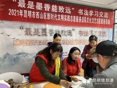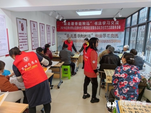 11月11日上午,由昆明市文联、西山区文明办、西山区新时代文明实践志愿服务总队、昆明市新时代文明实践文化文艺志愿服务二大队主办的“最是墨香能致远”主题书法学习交流活动在西山区棕树营街道社工站进行。