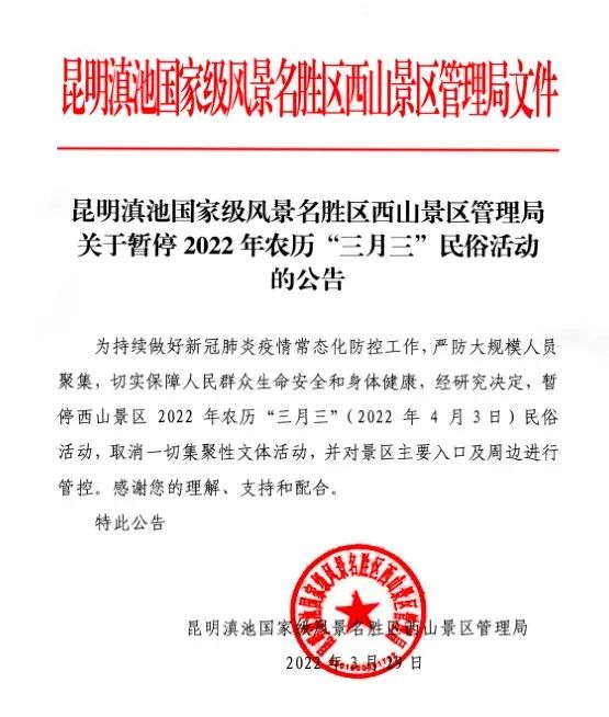 为持续做好新冠肺炎疫情常态化防控工作,严防大规模人员聚集,切实保障人民群众生命安全和身体健康,经研究决定,暂停西山景区2022 年农历“三月三”(2022年4月3日)民俗活动,取消一切聚集性文体活动,并对景区主要入口及周边进行管控。感谢您的理解、支持和配合。