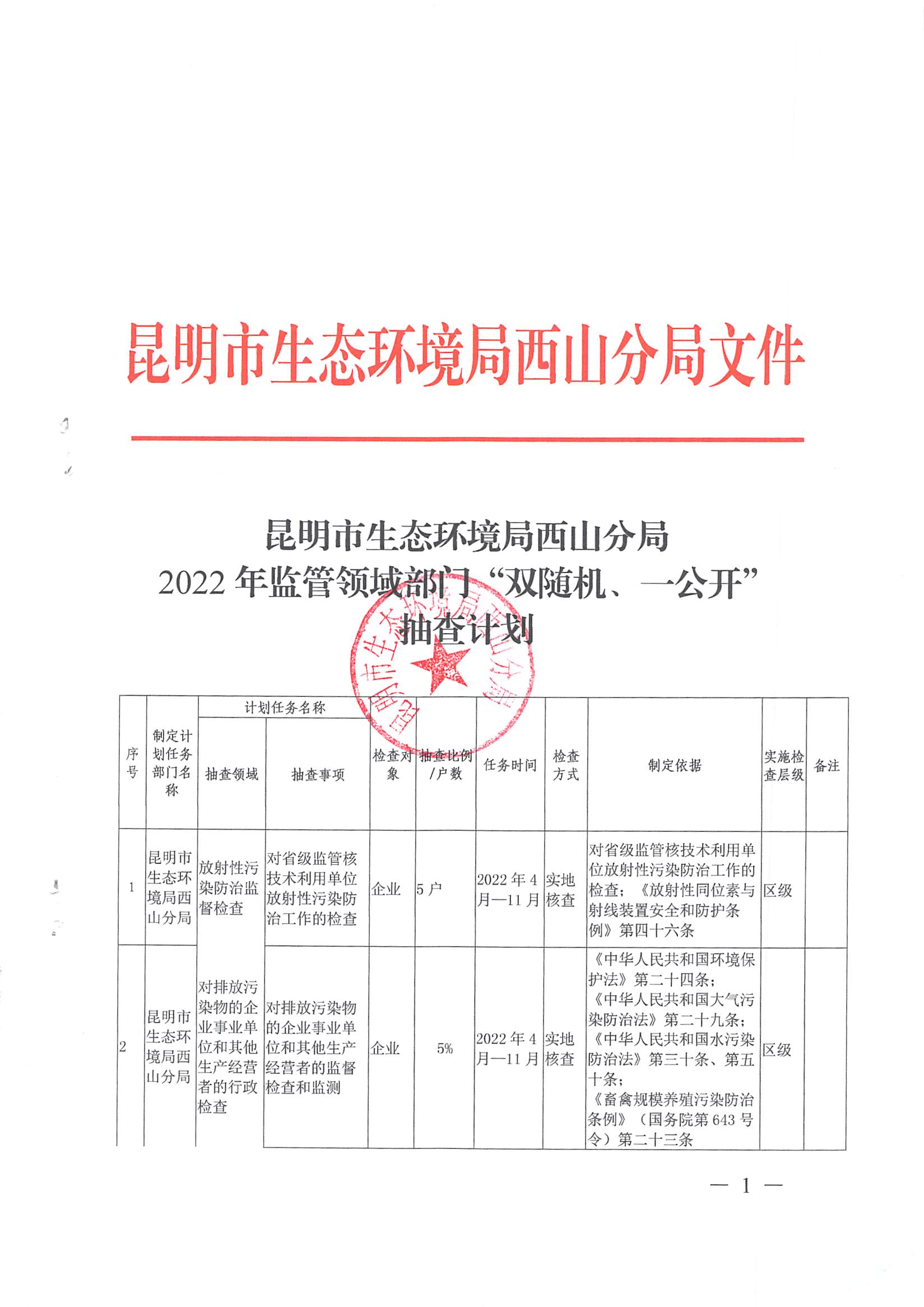 昆明市生态环境局西山分局监管领域部门“双随机、一公开”抽查计划