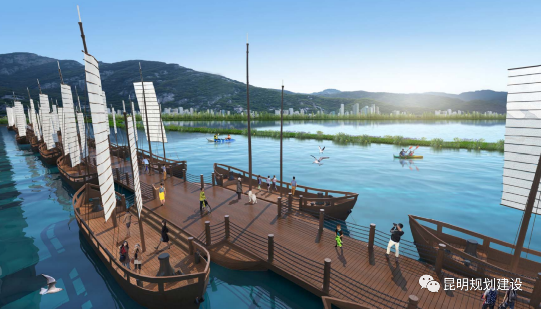 在规划时,浮桥设计方案将当地昔日“高峣古渡”的文化特色元素融入其中,取自“百舸争流、千帆竞发”之意境,打造渔家码头场景,展现滇池渔文化。