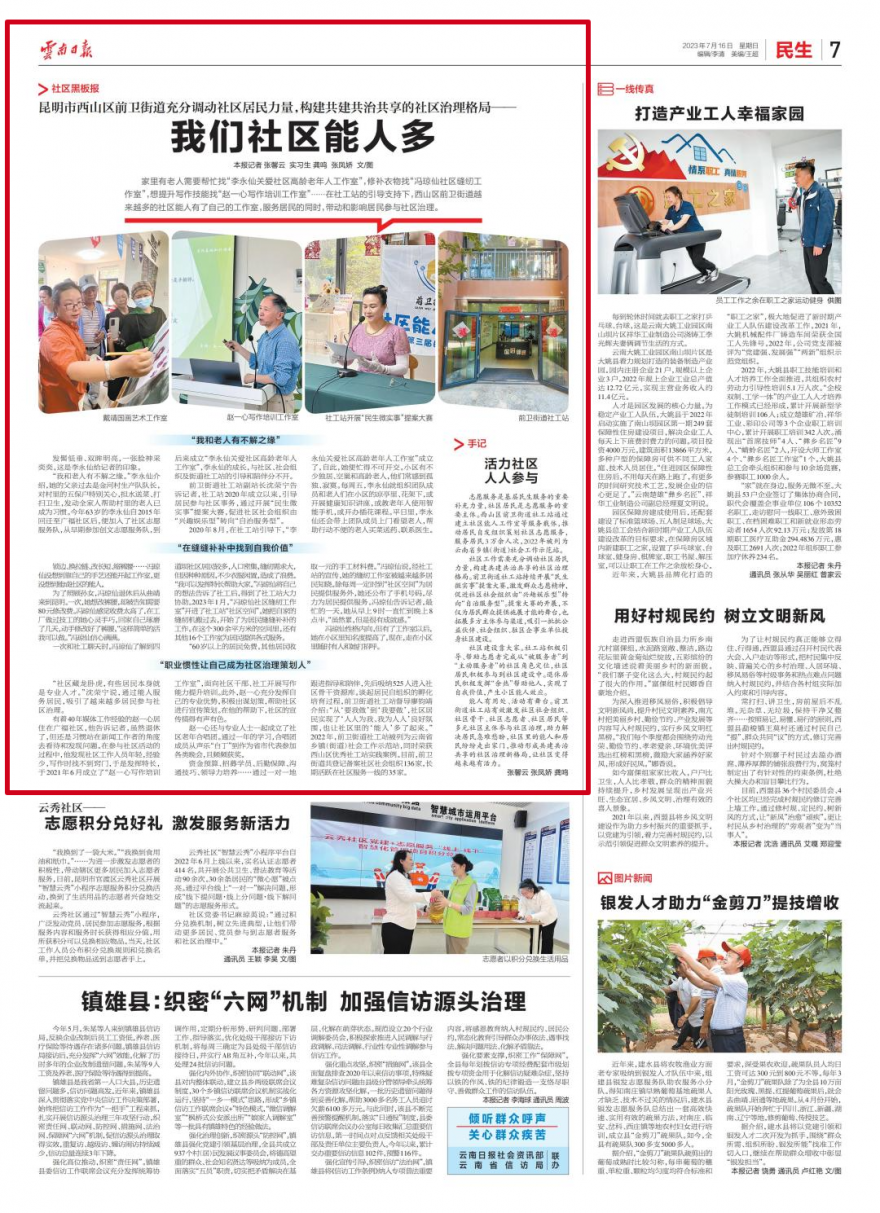 7月16日,《云南日报》07版刊发了《昆明市西山区前卫街道充分调动社区居民力量,构建共建共治共享的社区治理格局——我们社区能人多》聚焦西山区前卫街道社区治理工作