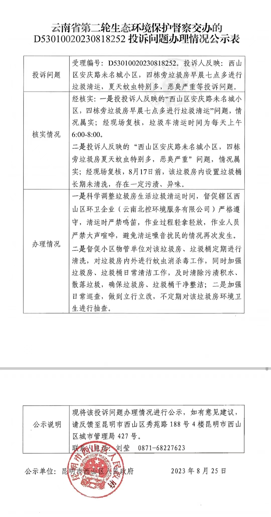 关于云南省第二轮生态环境保护督察D53010020230818252交办投诉问题办理情况公示表