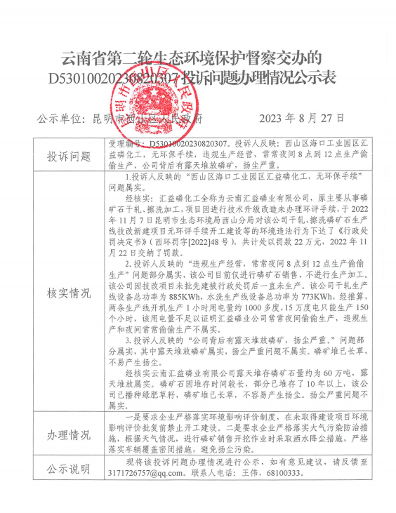 云南省第二轮生态环境保护督察交办的D53010020230820307投诉问题办理情况公示表