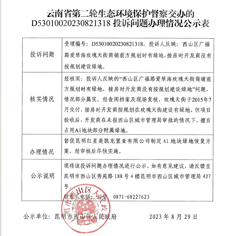 关于云南省第二轮生态环境保护督察D53010020230821318交办投诉问题办理情况公示表