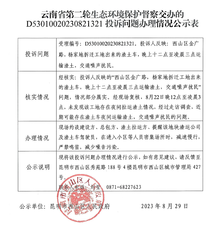 关于云南省第二轮生态环境保护督察D53010020230821321交办投诉问题办理情况公示表
