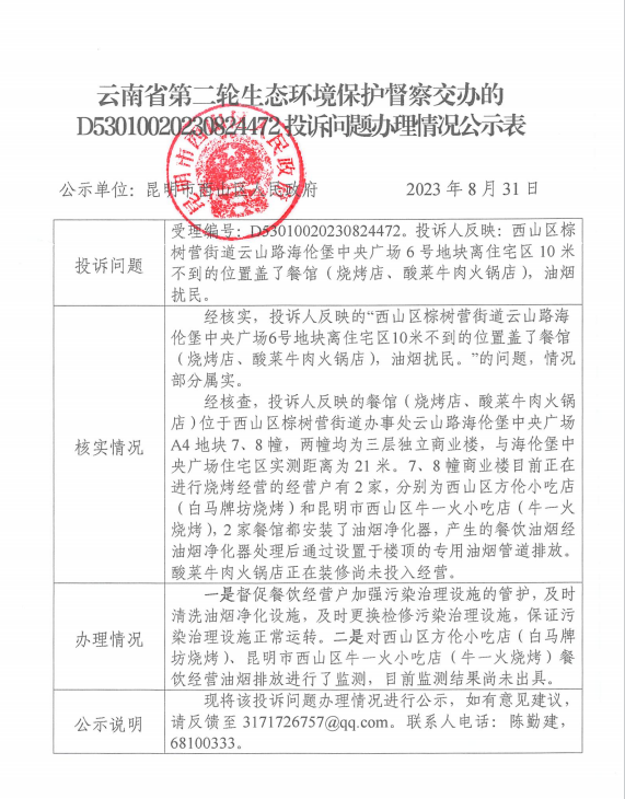 云南省第二轮生态环境保护督察交办的D53010020230824472投诉问题办理情况公示表