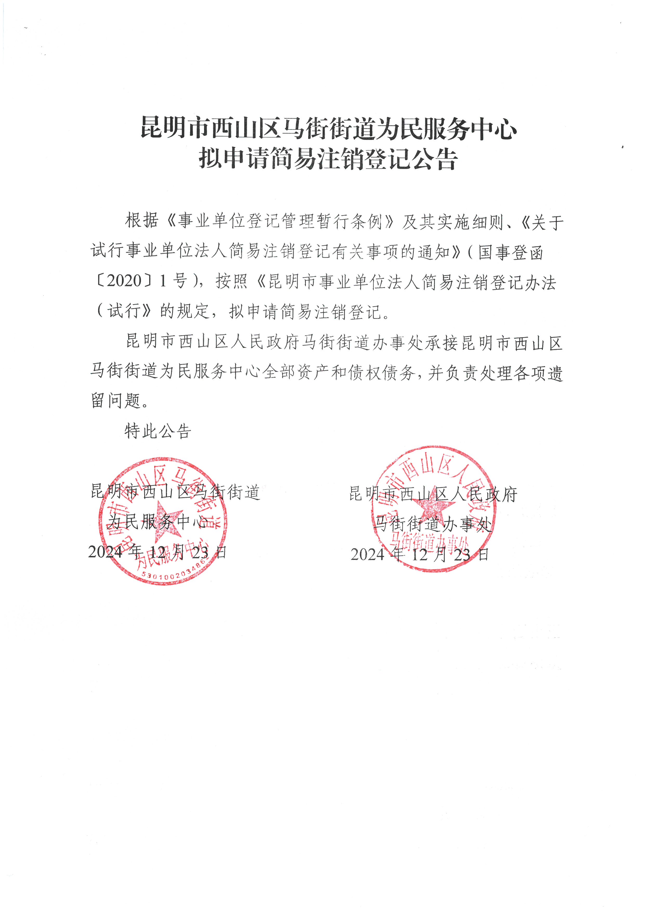 昆明市西山区马街街道为民服务中心拟申请简易注销登记公告