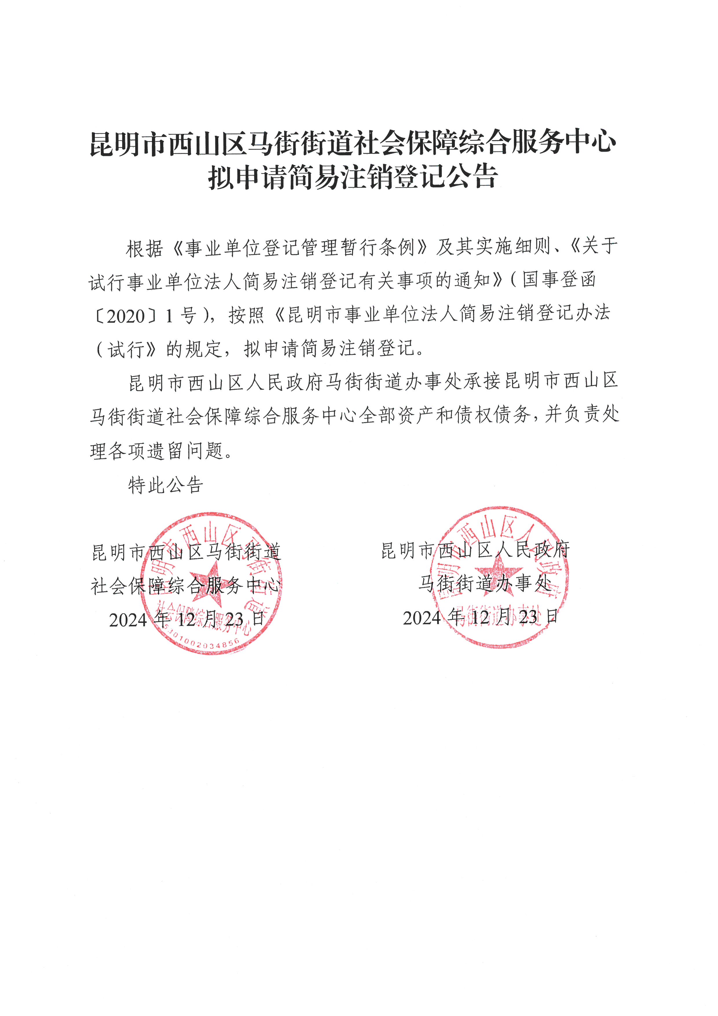 昆明市西山区马街街道办事处社会保障综合服务中心拟申请简易注销登记公告