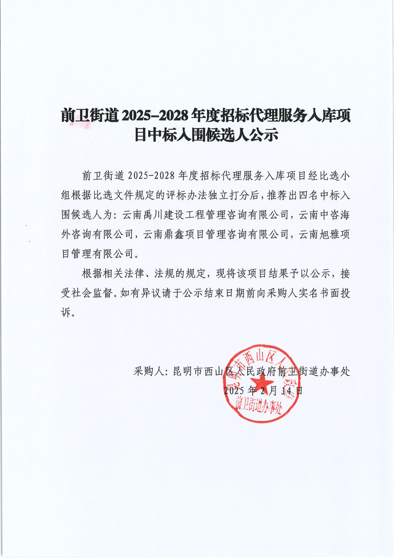 前卫街道2025-2028年度招标代理服务入库项目中标入围候选人公示