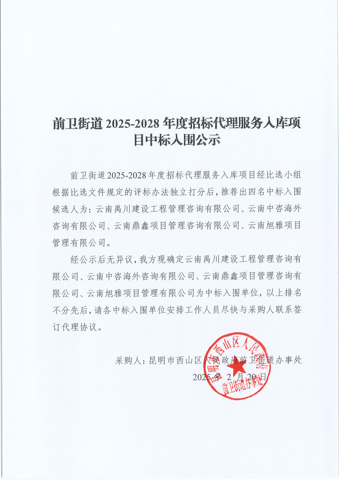 前卫街道2025-2028年度招标代理服务入库项目中标入围公示