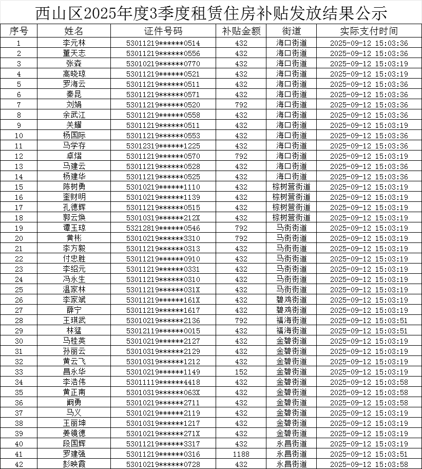 西山区2025年度3季度租赁住房补贴发放结果公示