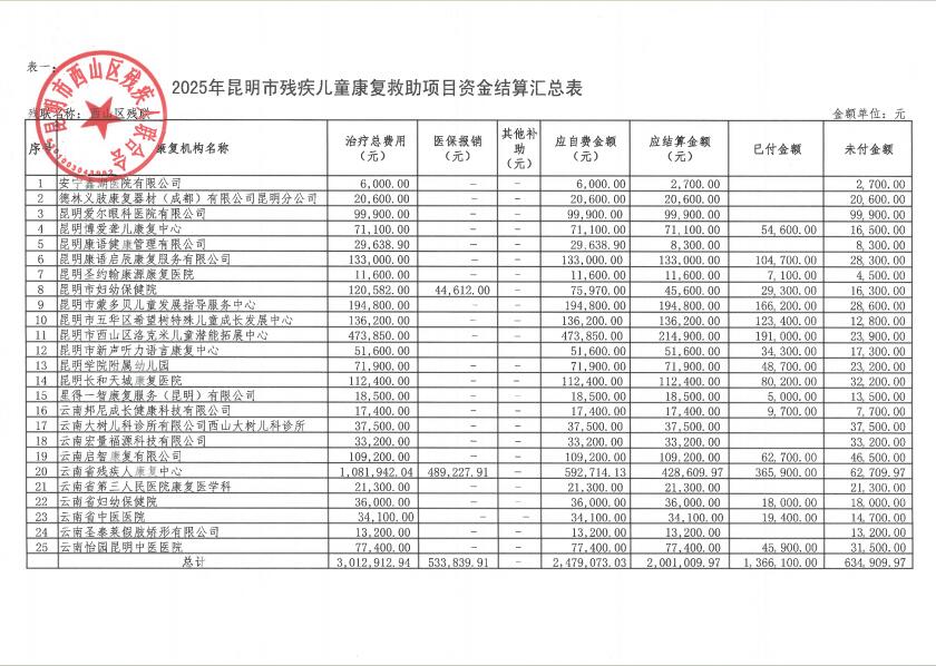 2025年昆明市残疾儿童康复救助项目资金结算汇总表